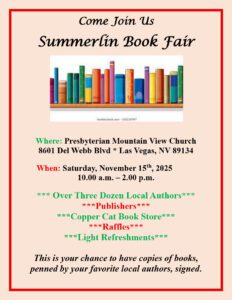 Many thanks to Dianne Romano of the Sun City Summerlin Reader’s Book Club and Shane Jensen of the Mountain View Presbyterian Church in Sun City for spearheading this event and making it happen…..and to all my fellow participating authors.